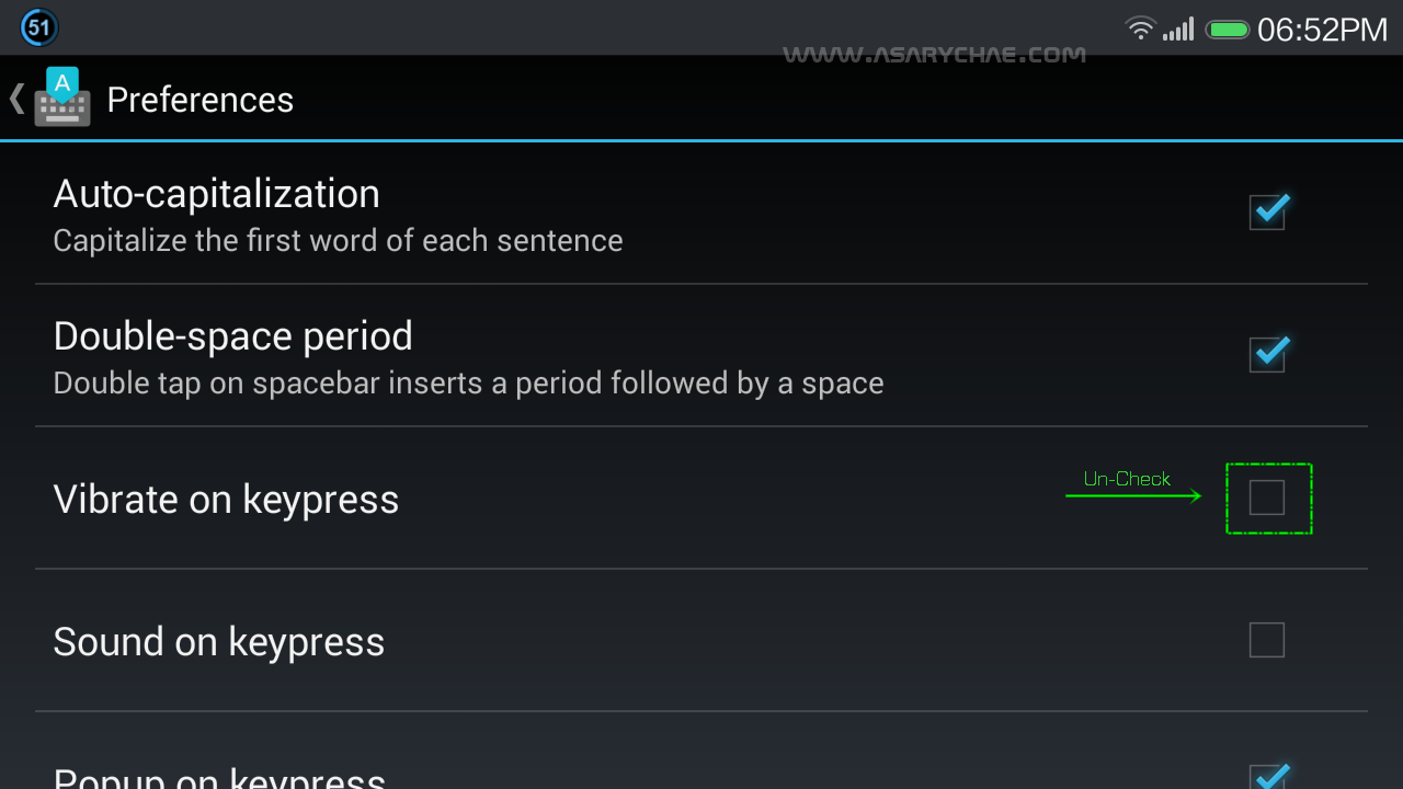 Atau langsung masuk saja ke " All Settings - System - Language and Input - Keyboards and Input Methods - Choose Google Keyboard and Expand - Preferences - Un-check Vibrate on Keypress "